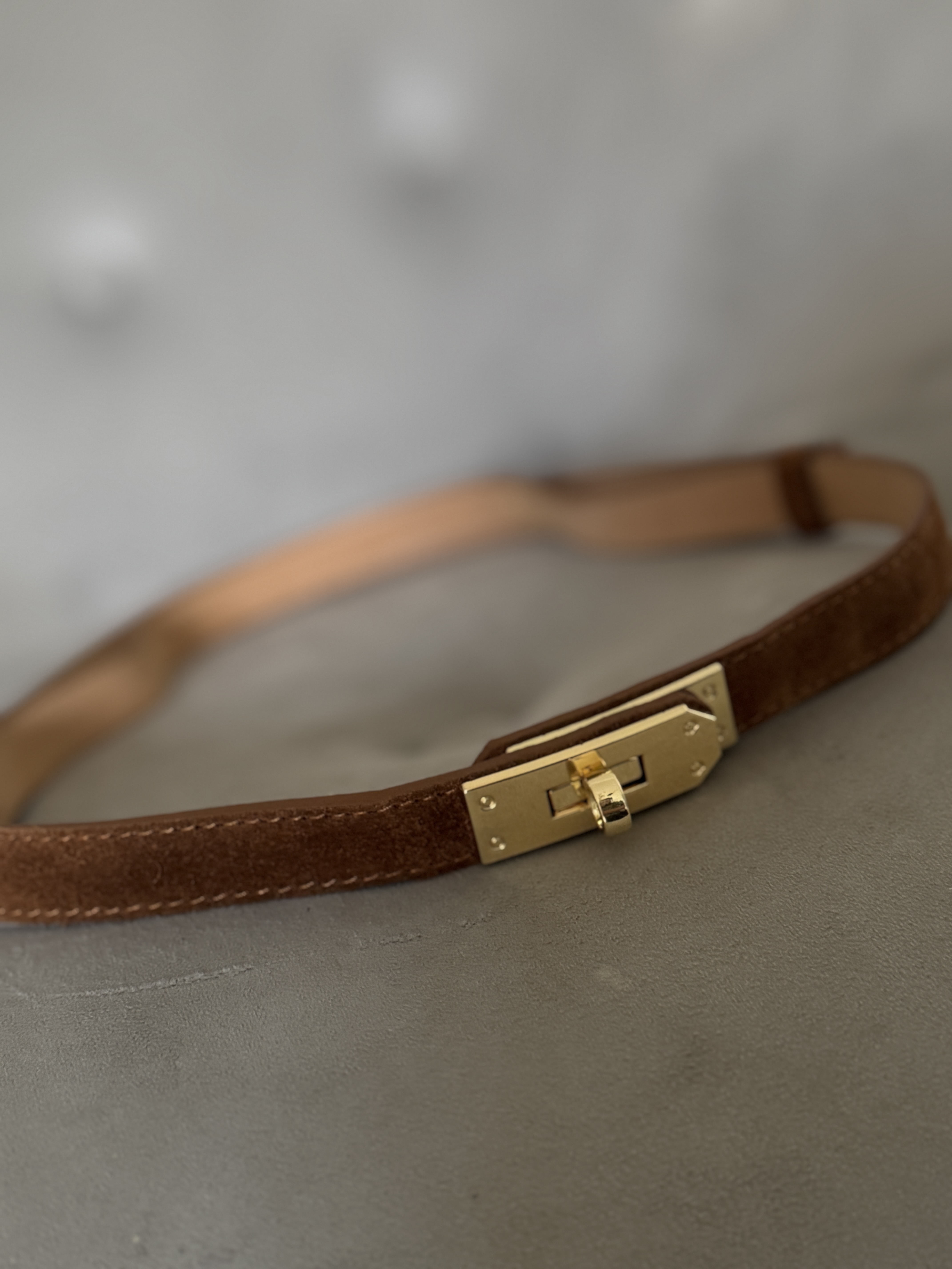 Brązowy regulowany pasek ze skóry naturalnej zamszowy ze złotą klamerką