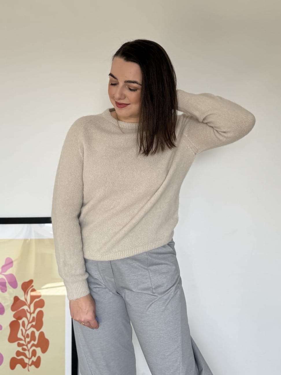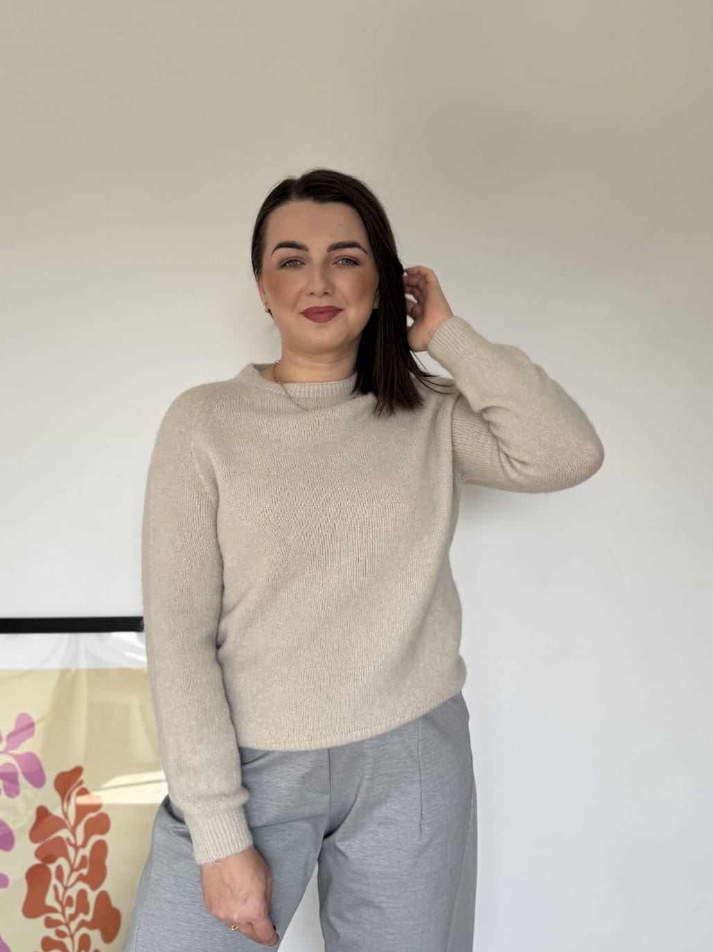 Prosty, ponadczasowy sweter wykonany z dzianiny z dodatkiem baby alpaki, która słynie ze swojej wyjątkowej miękkości i przyjemnego ciepła. Materiał jest lekki, delikatny dla skóry i bardzo komfortowy w noszeniu, dzięki czemu sweter świetnie sprawdzi się w codziennych stylizacjach.