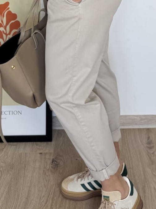Klasyczne spodnie w odcieniu beżu, które łączą wygodę i ponadczasowy styl. Wykonane w 100% z bawełny, są lekkie, oddychające i bardzo komfortowe w noszeniu przez cały dzień.