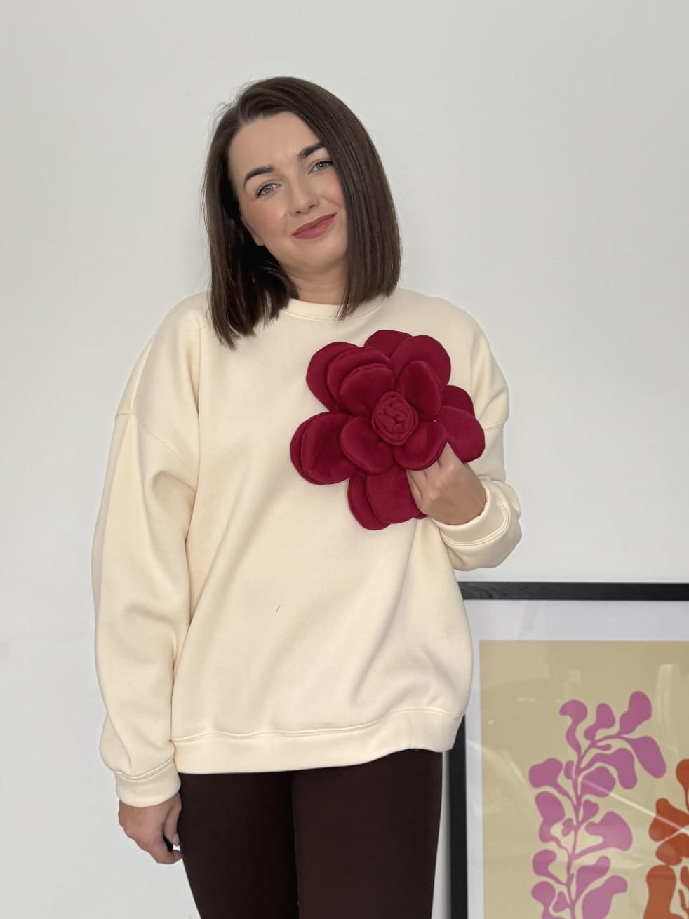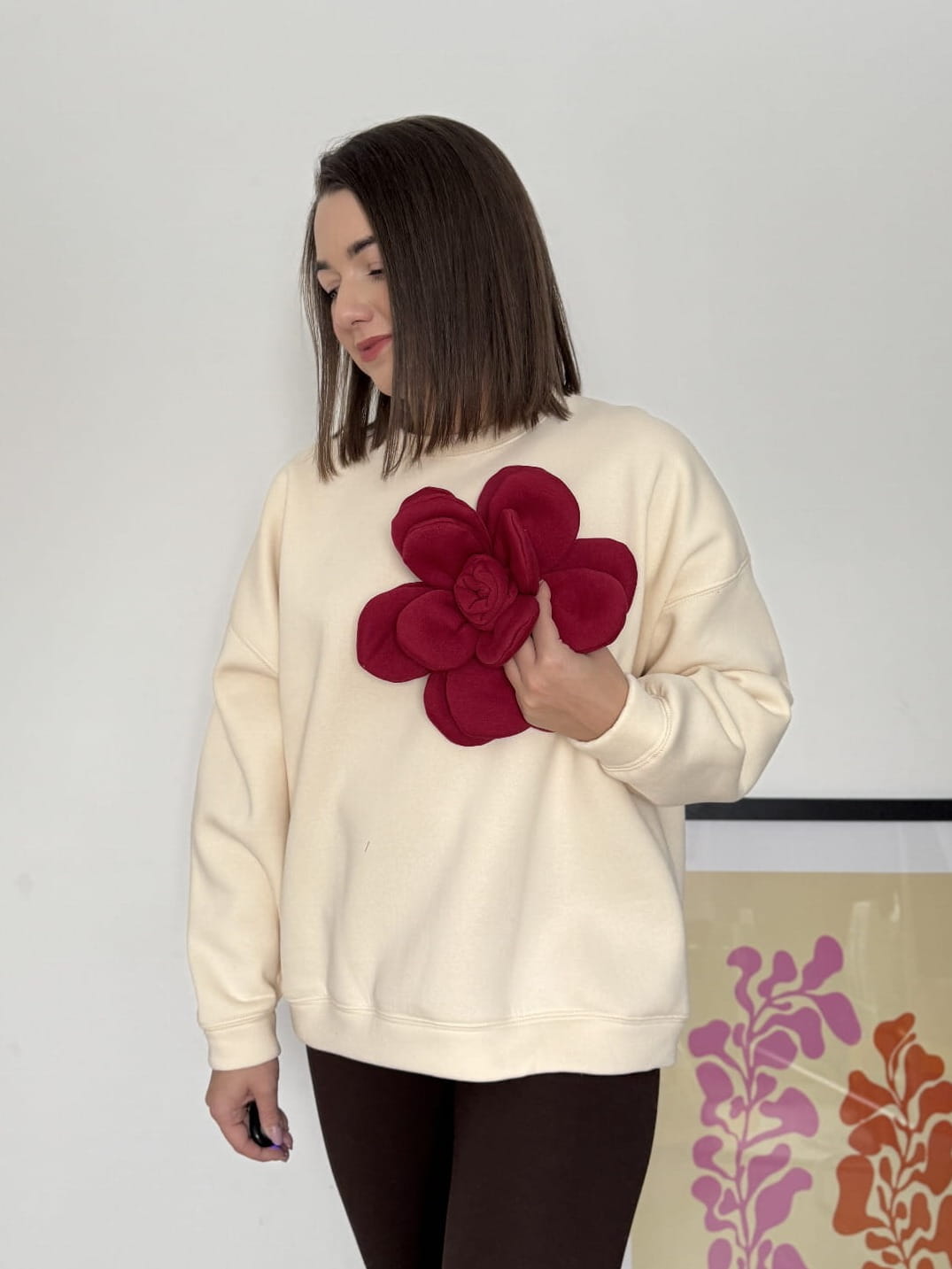 Bluza oversize z efektownym, odpinanym kwiatem to idealna opcja, jeśli lubisz wygodę, ale chcesz mieć „coś wow” w stylizacji. Możesz nosić ją na dwa sposoby: klasycznie (bez kwiatu) albo z mocnym akcentem, który robi cały look. Świetna do jeansów, narciarek i spódnic.