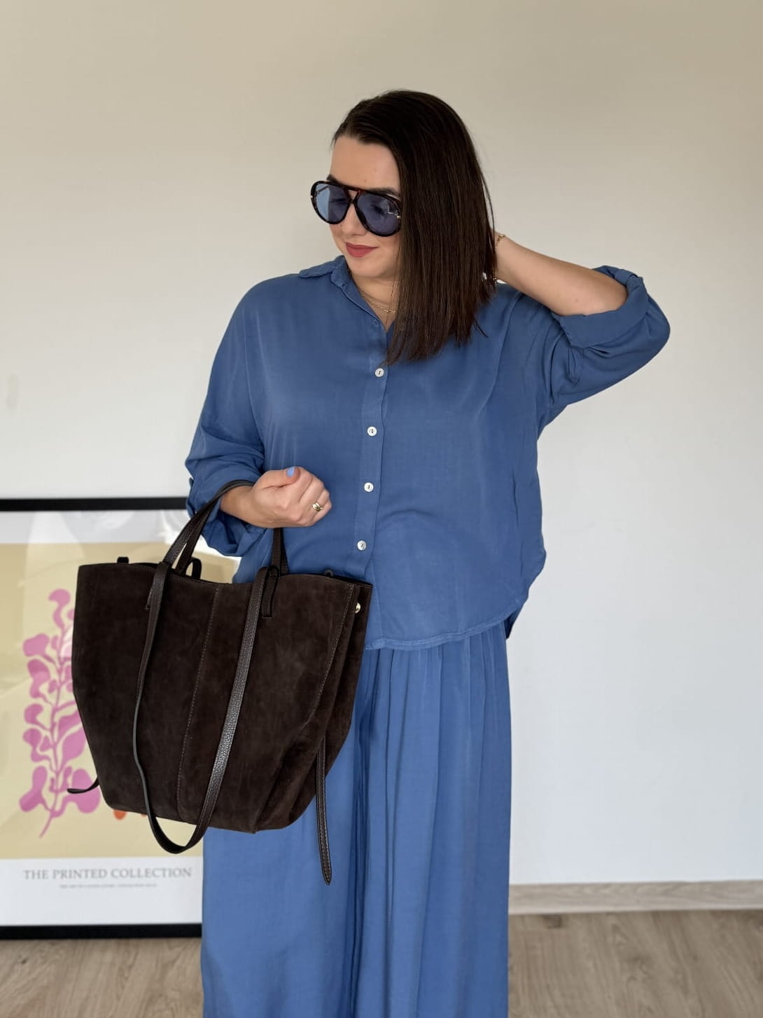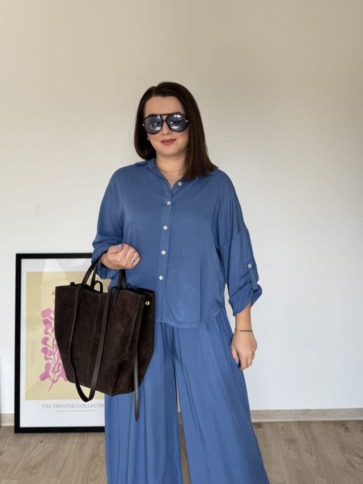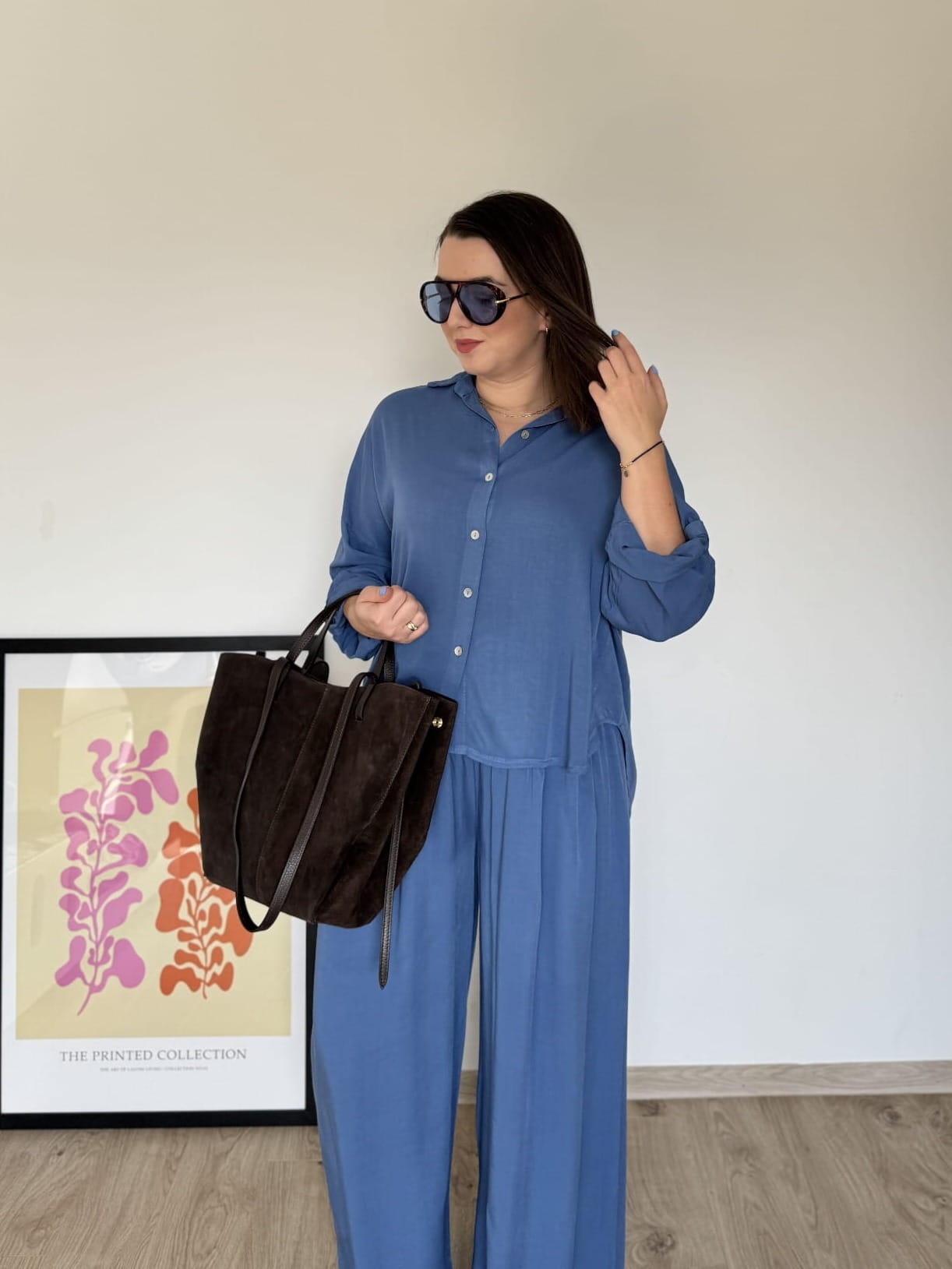 Elegancki komplet wykonany z miękkiej, przyjemnej w dotyku tkaniny 50% wiskoza, 50% lyocell, który łączy komfort noszenia z modnym, ponadczasowym stylem.