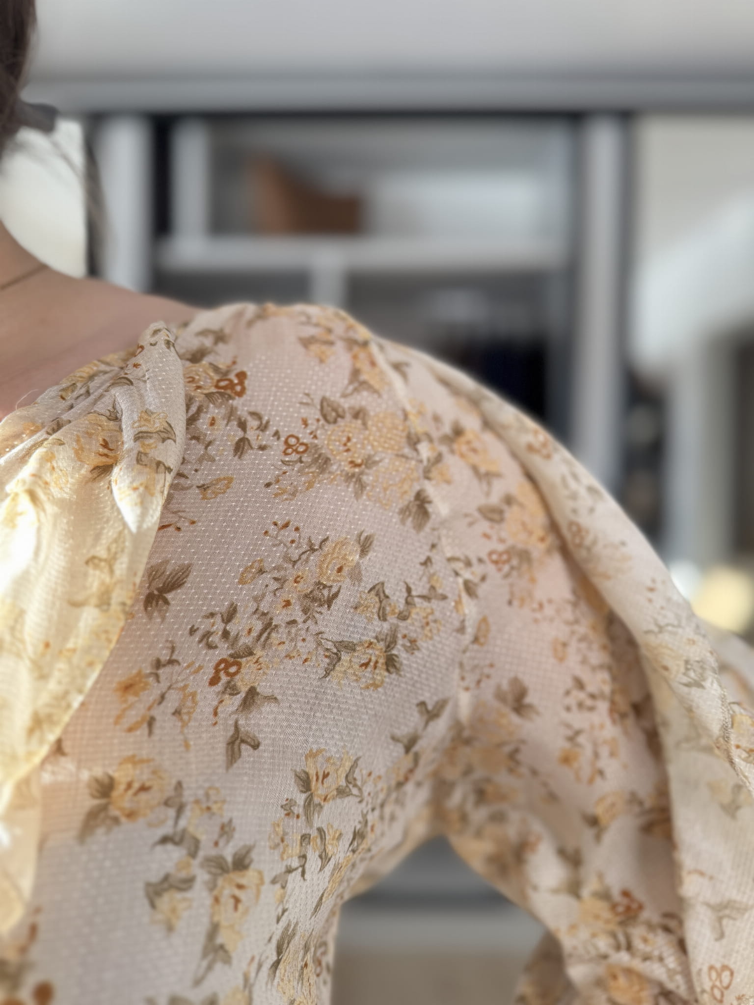Koszula w kwiatki z romantyczną falbanką z dodatkiem jedwabiu beżowo-żółta