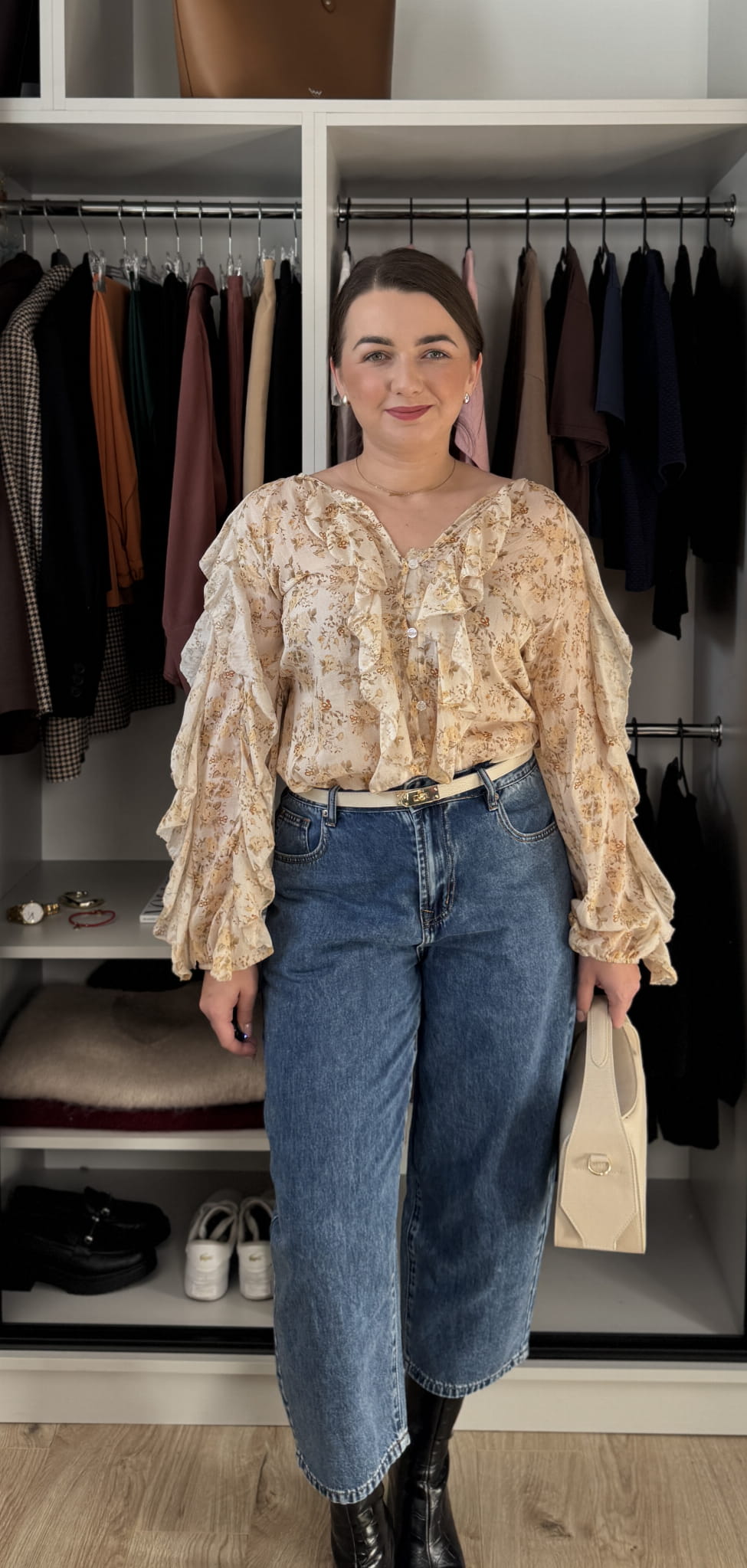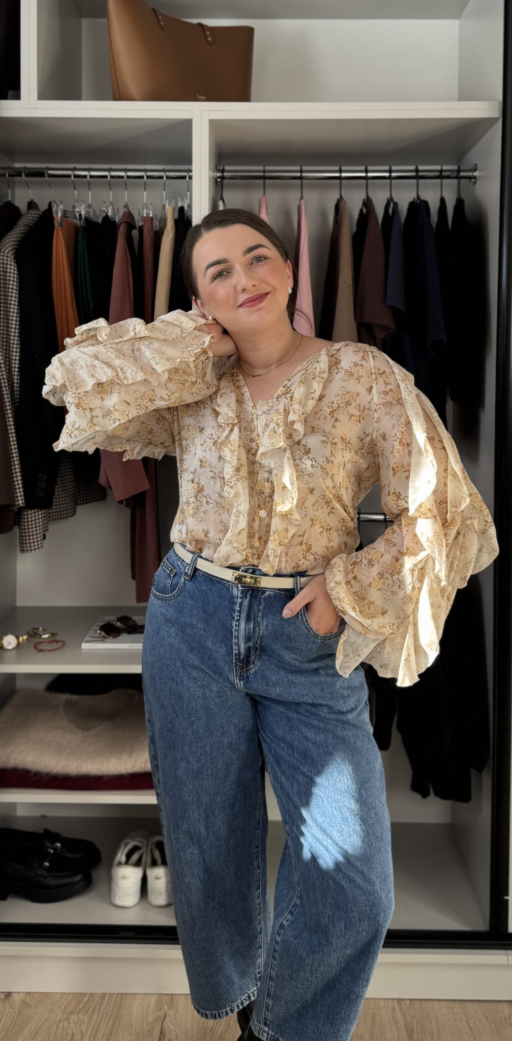 Beżowo-żółta koszula w drobne kwiatki wyróżnia się subtelną kolorystyką, dziewczęcym printem i ozdobną falbanką, która dodaje jej romantycznego charakteru. To model, który pięknie ożywia stylizację i robi efekt „wow”, ale nadal wygląda lekko i klasycznie.
