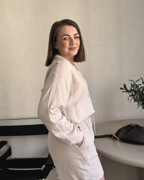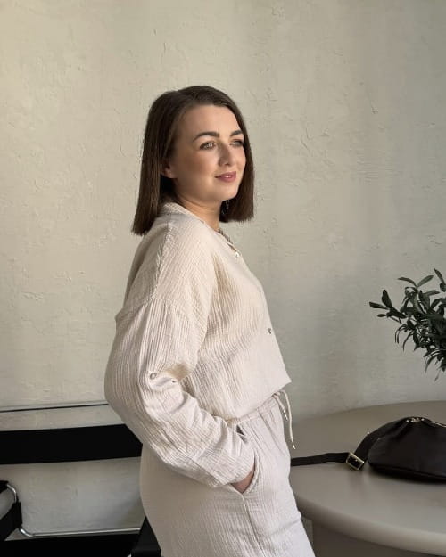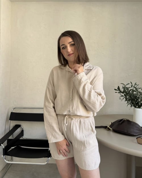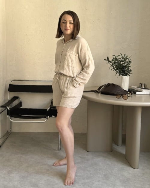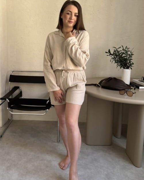 Lekki i przewiewny komplet wykonany z wysokiej jakości muślinu, który zapewnia maksymalny komfort i swobodę noszenia. Koszula o luźnym kroju idealnie komponuje się ze spodniami, tworząc stylowy i wygodny zestaw na każdą okazję. Naturalny materiał gwarantuje oddychalność, a minimalistyczny design sprawia, że komplet pasuje zarówno do casualowych, jak i bardziej eleganckich stylizacji. Doskonały wybór na cieplejsze dni – modny, wygodny i niezwykle uniwersalny!