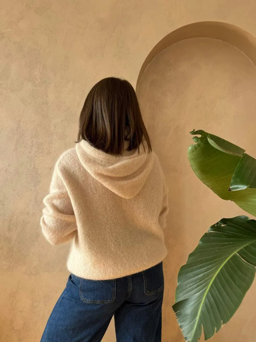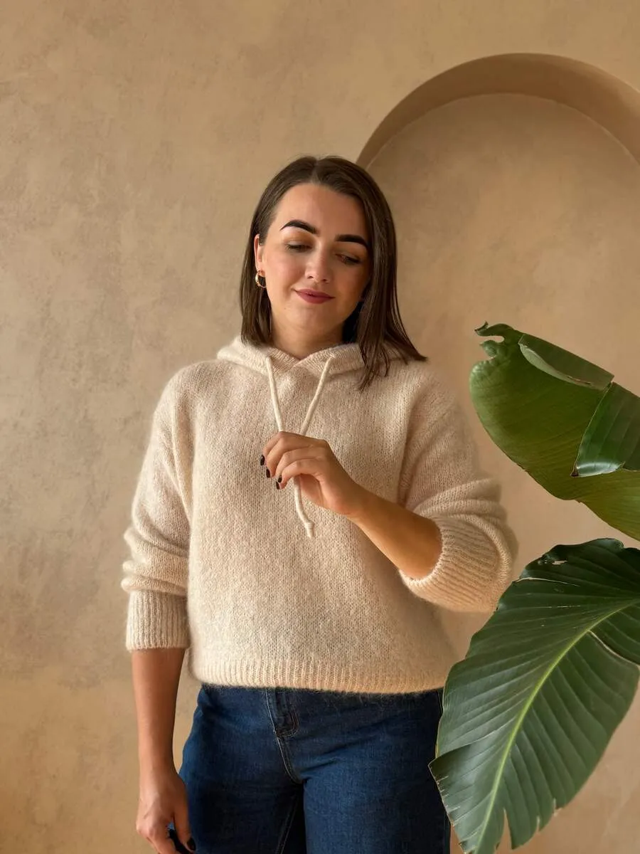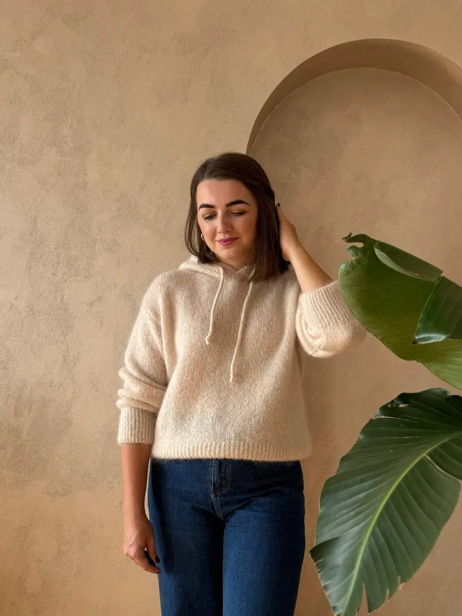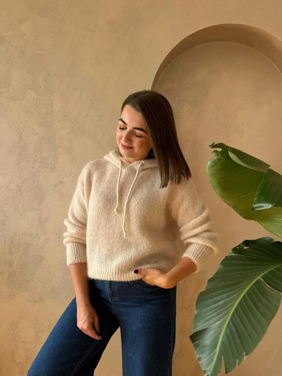 Miękki, puszysty sweter damski z kapturem w odcieniu klasycznego beżu to idealna propozycja na chłodniejsze dni. Wykonany z mieszanki 40% moheru i 10% wełny, otula ciepłem, a jednocześnie pozostaje lekki i przyjemny w noszeniu. Naturalne włókna sprawiają, że skóra oddycha, a sweter jest trwały i ponadczasowy – to baza garderoby, do której będziesz wracać przez lata.