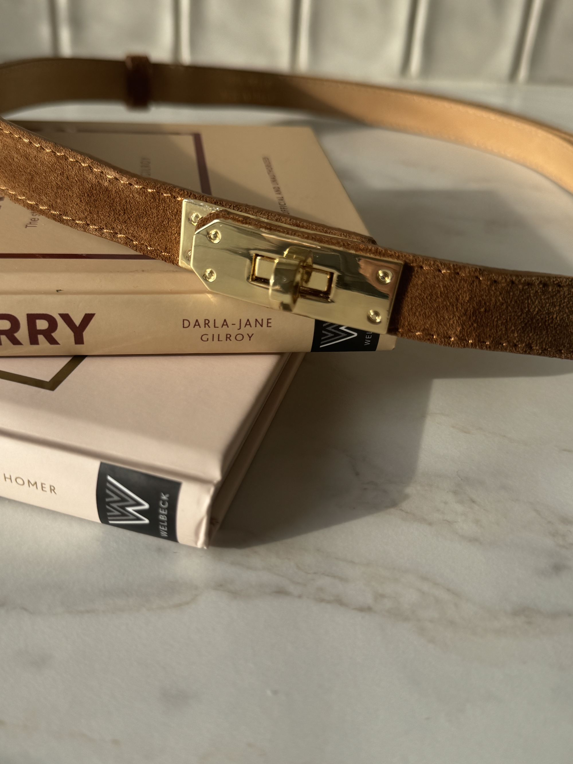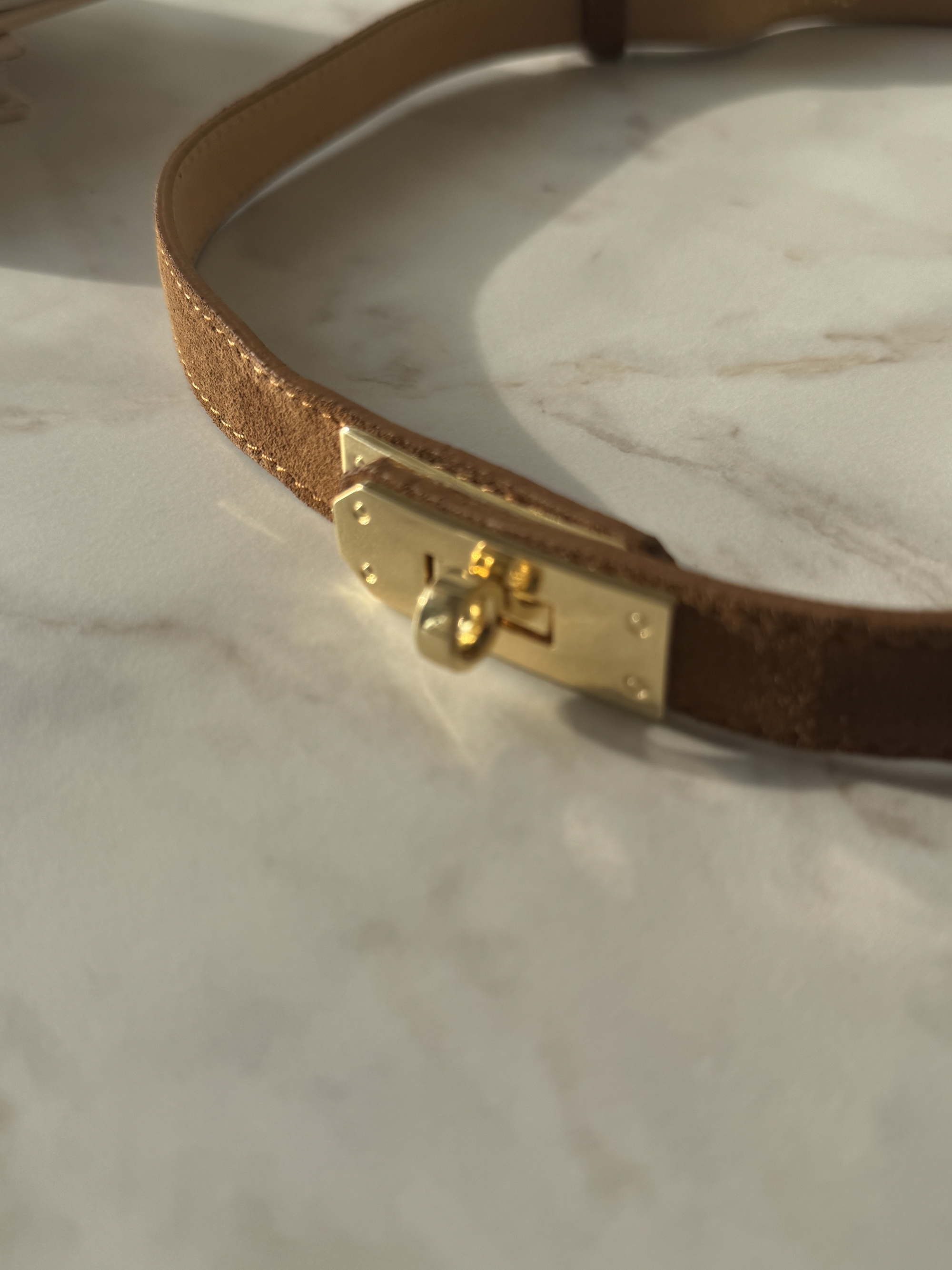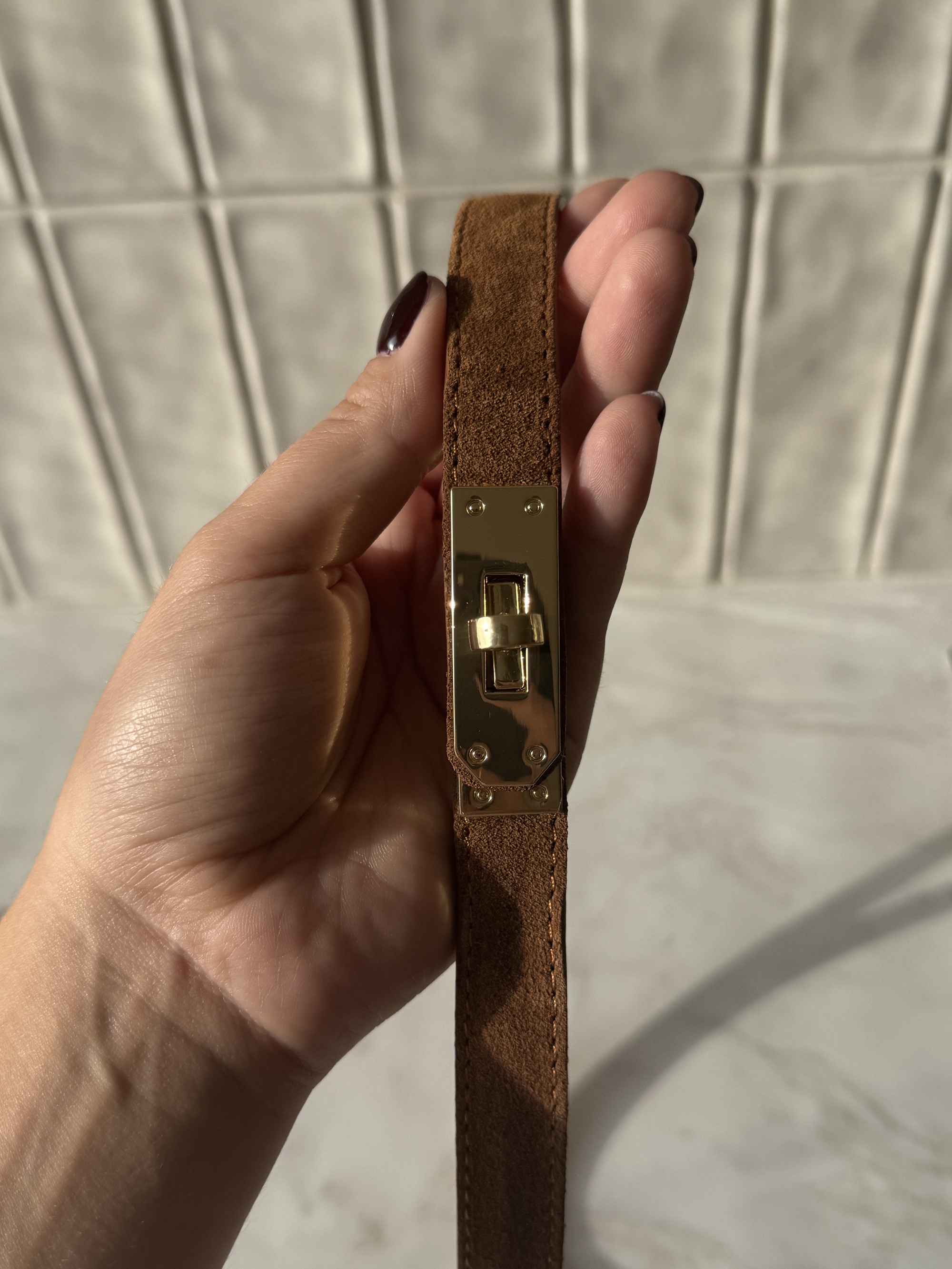 Regulowany pasek ze skóry naturalnej zamszowy ze złotą klamerką | brązowy