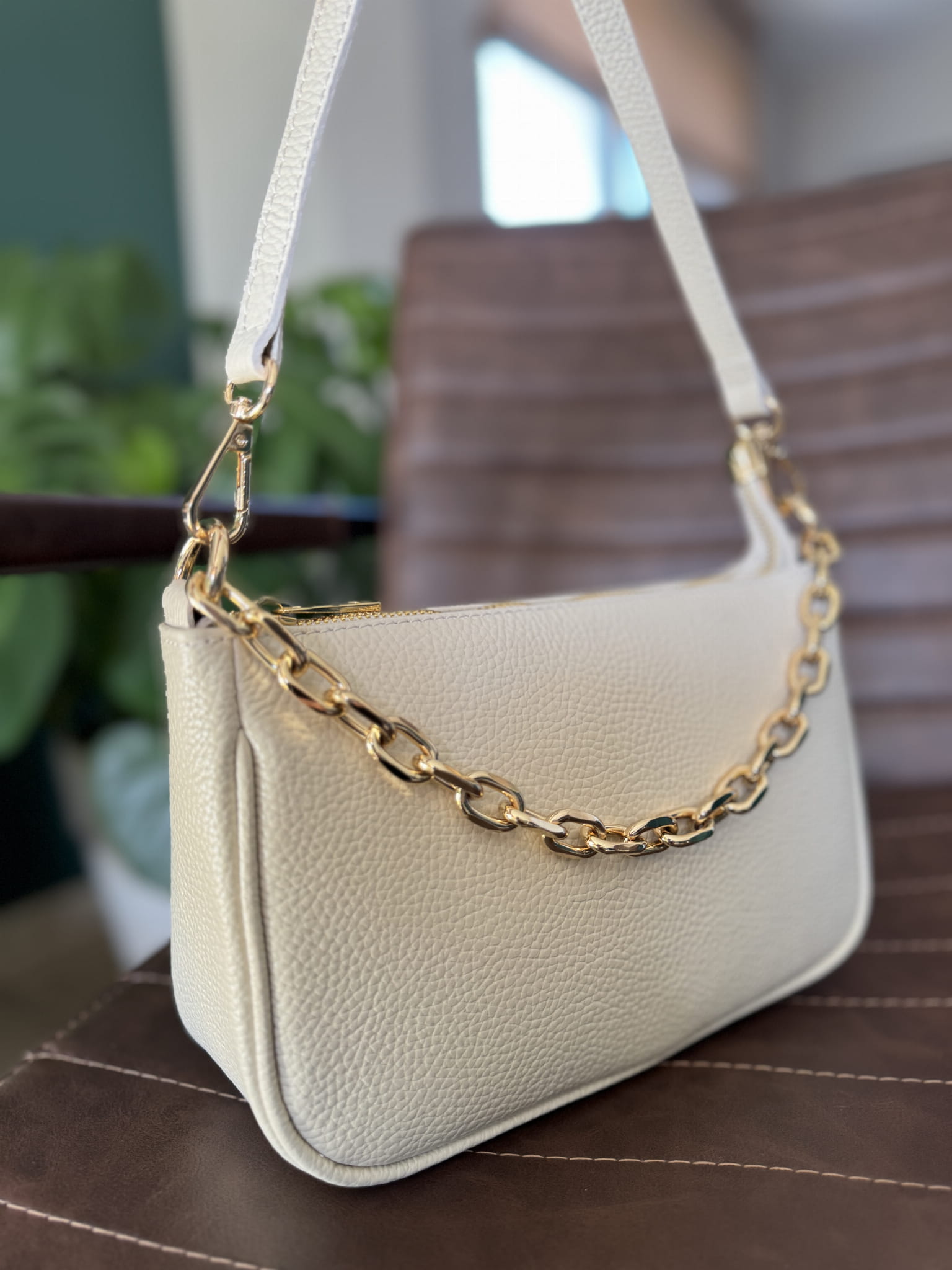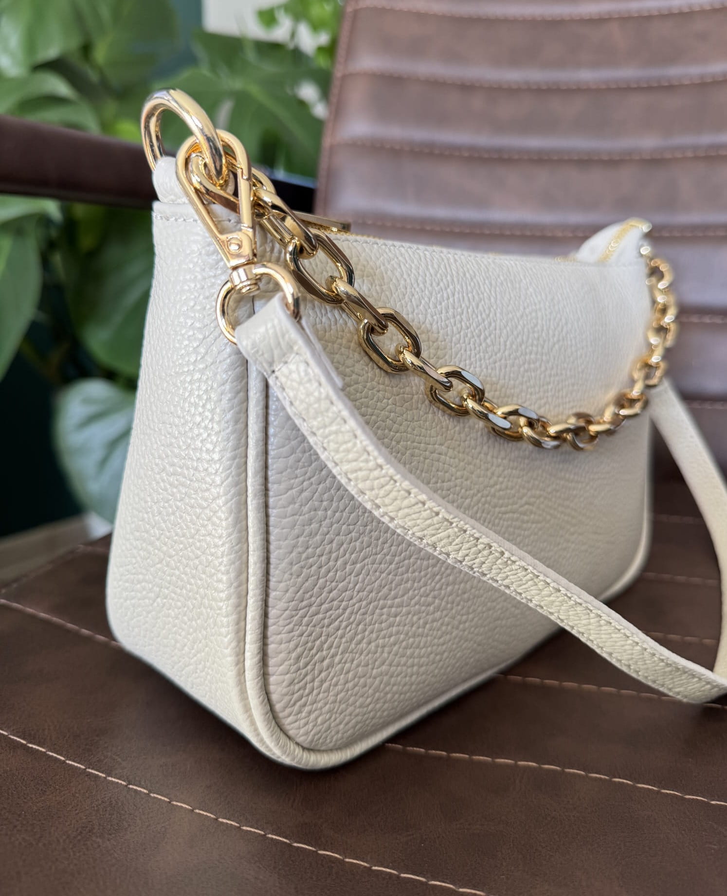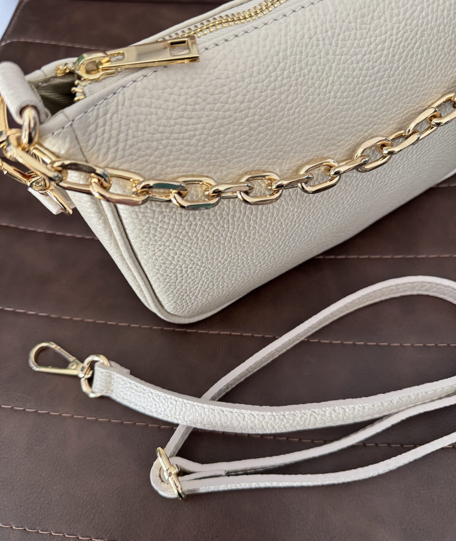 Skórzana torebka z ozdobnym łańcuszkiem na ramię beżowa