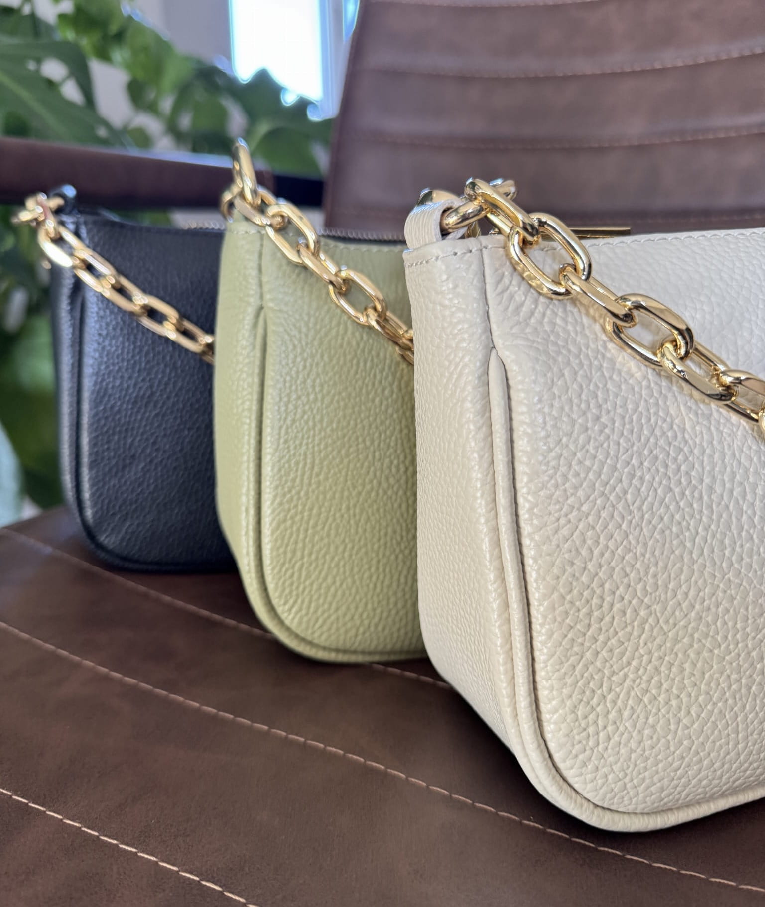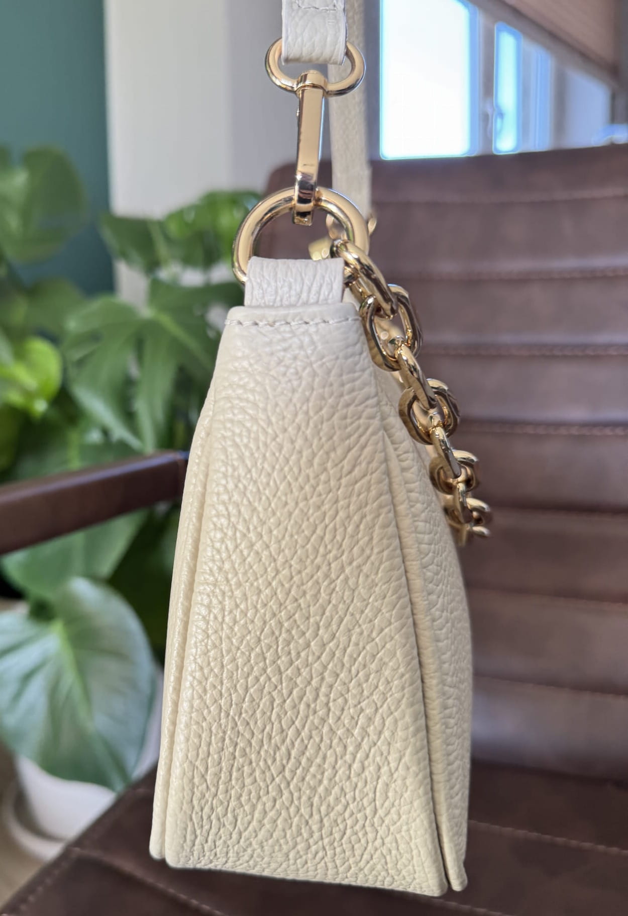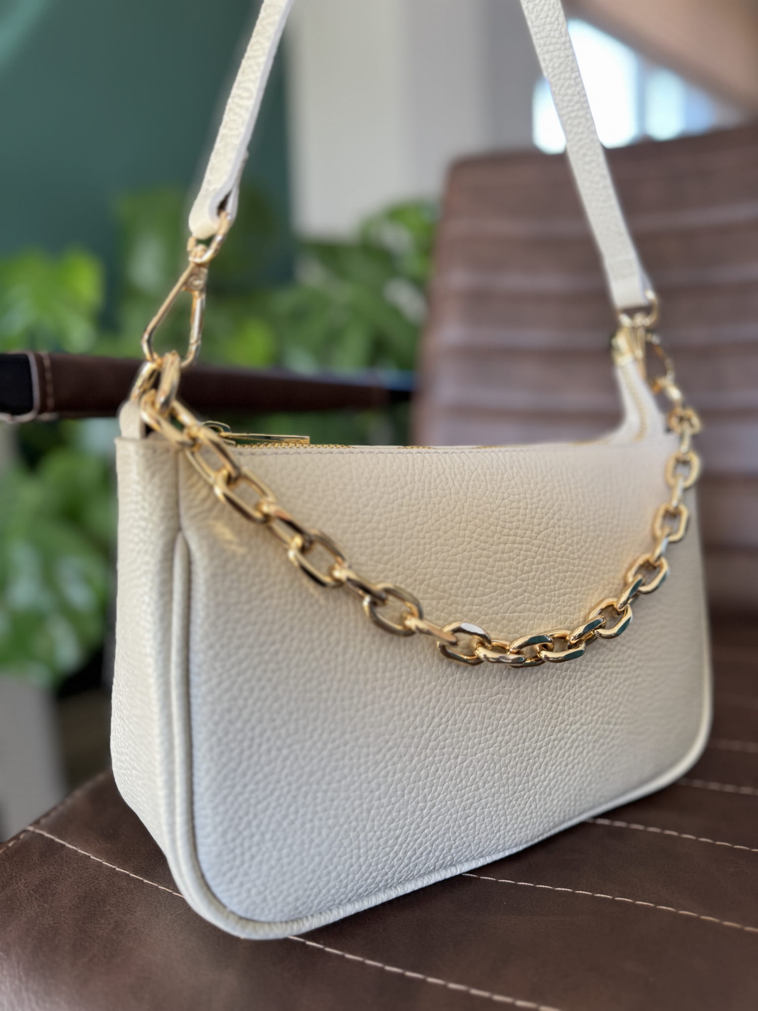 Skórzana torebka z ozdobnym łańcuszkiem na ramię beżowa