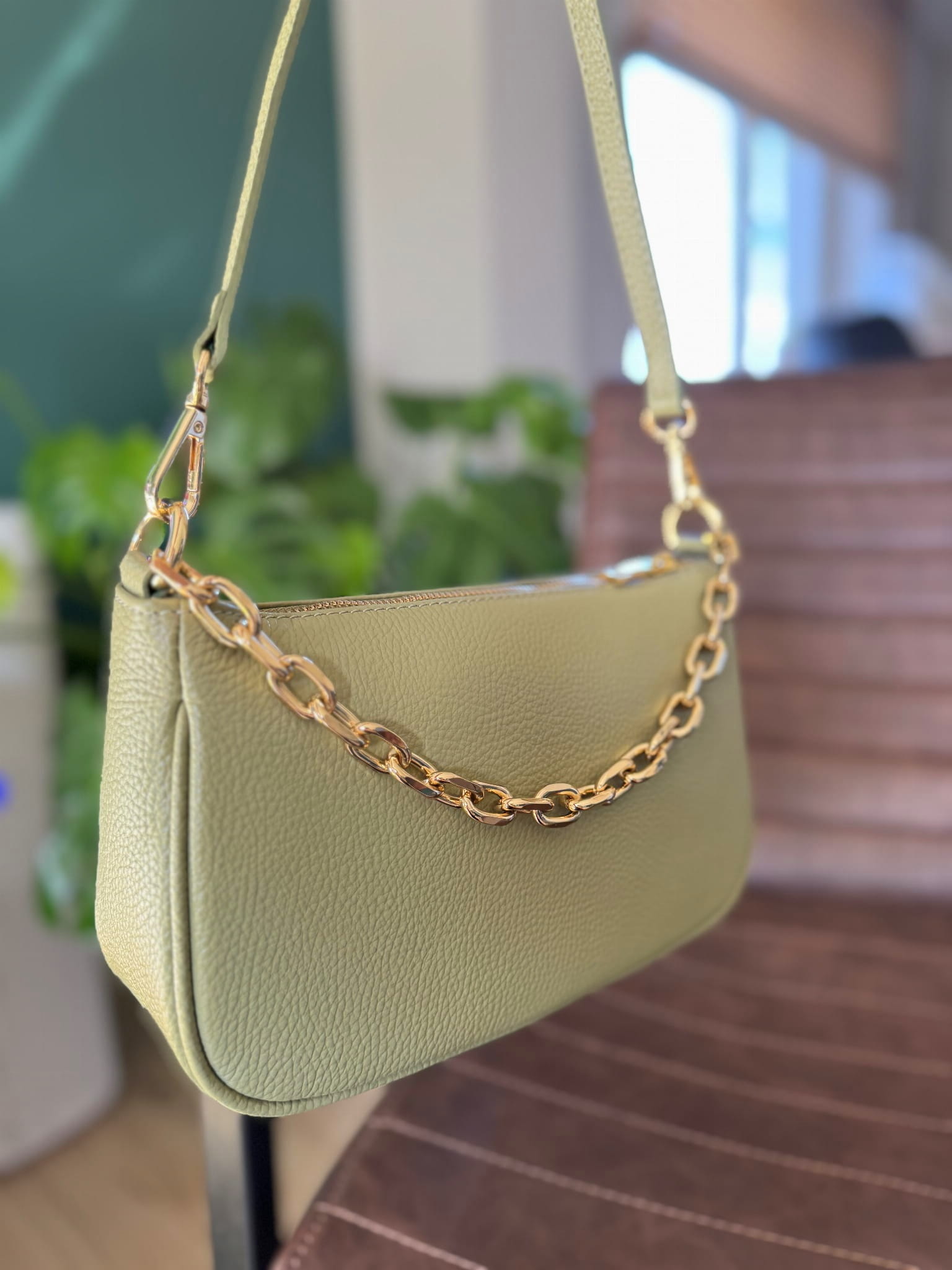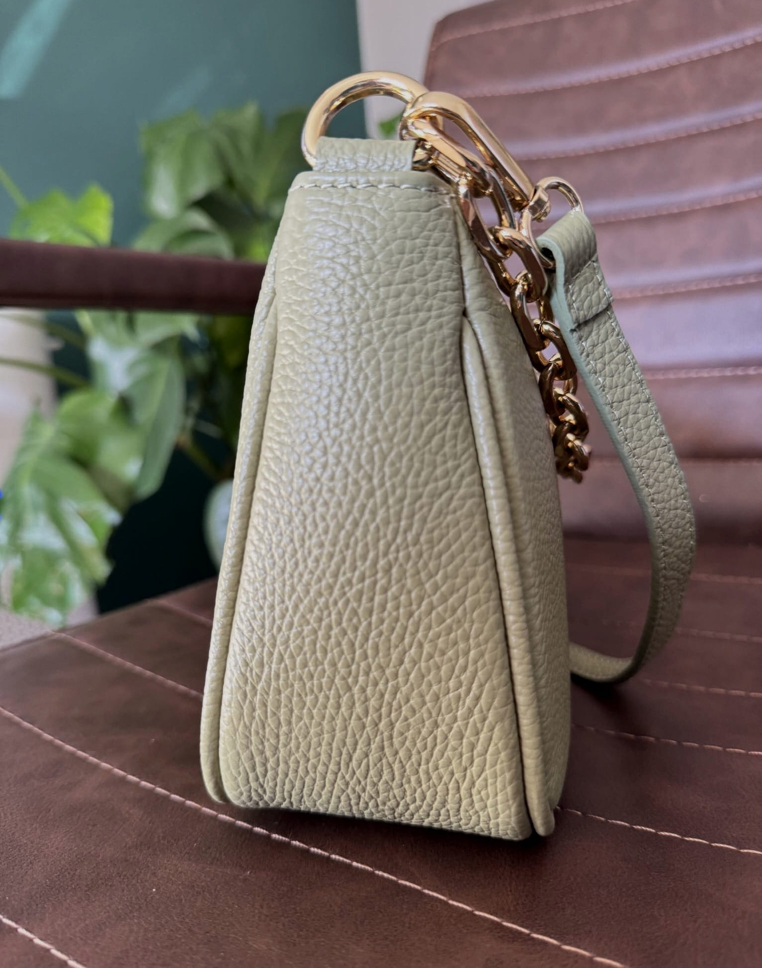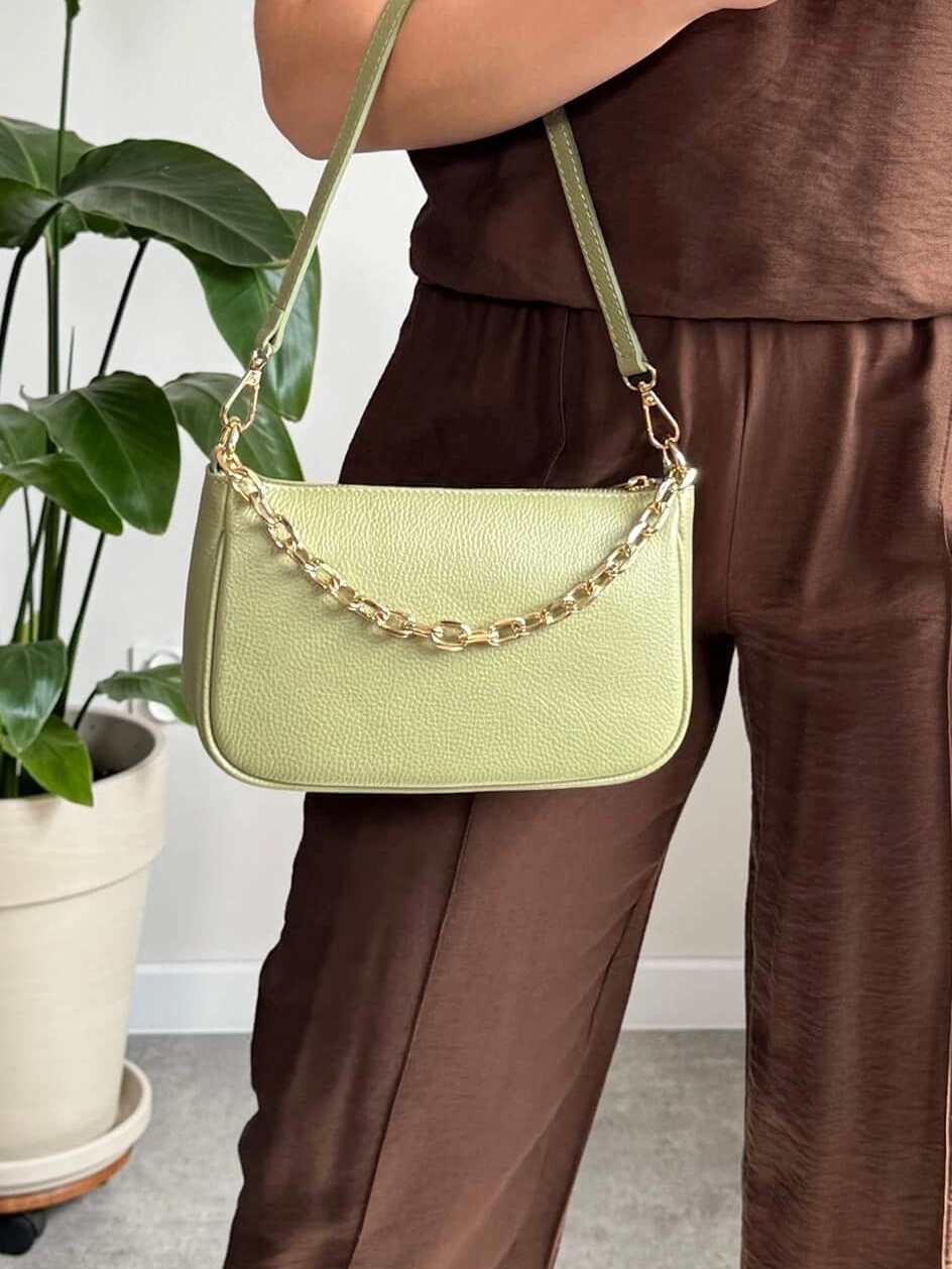 Skórzana torebka z ozdobnym łańcuszkiem na ramię oliwka