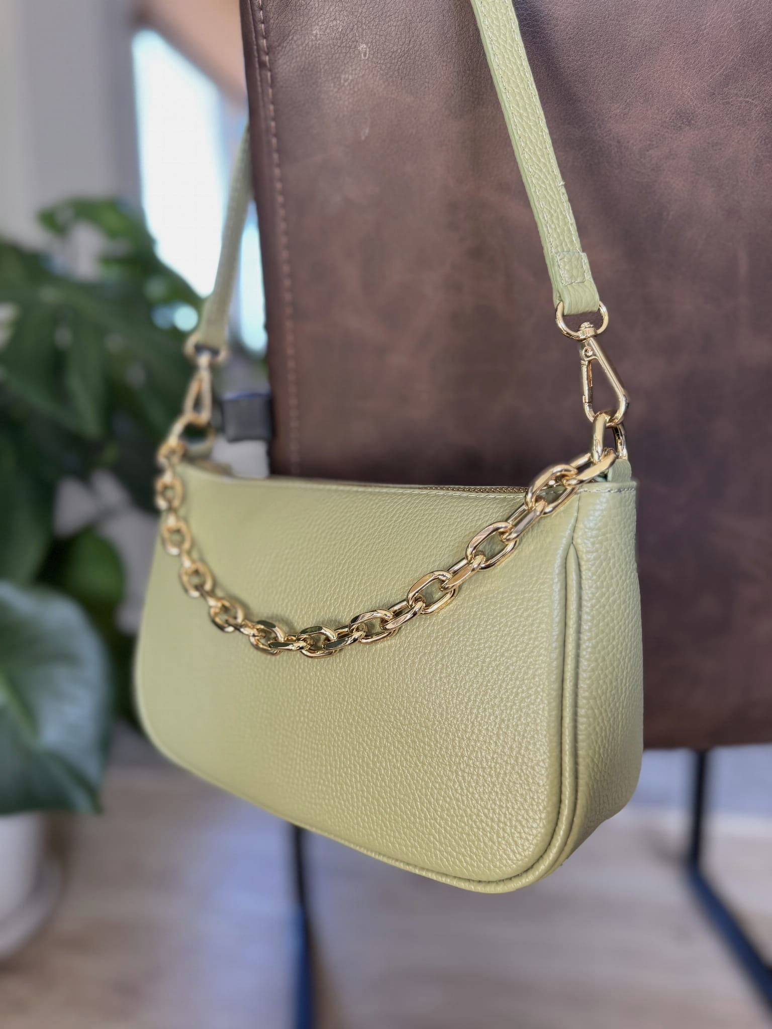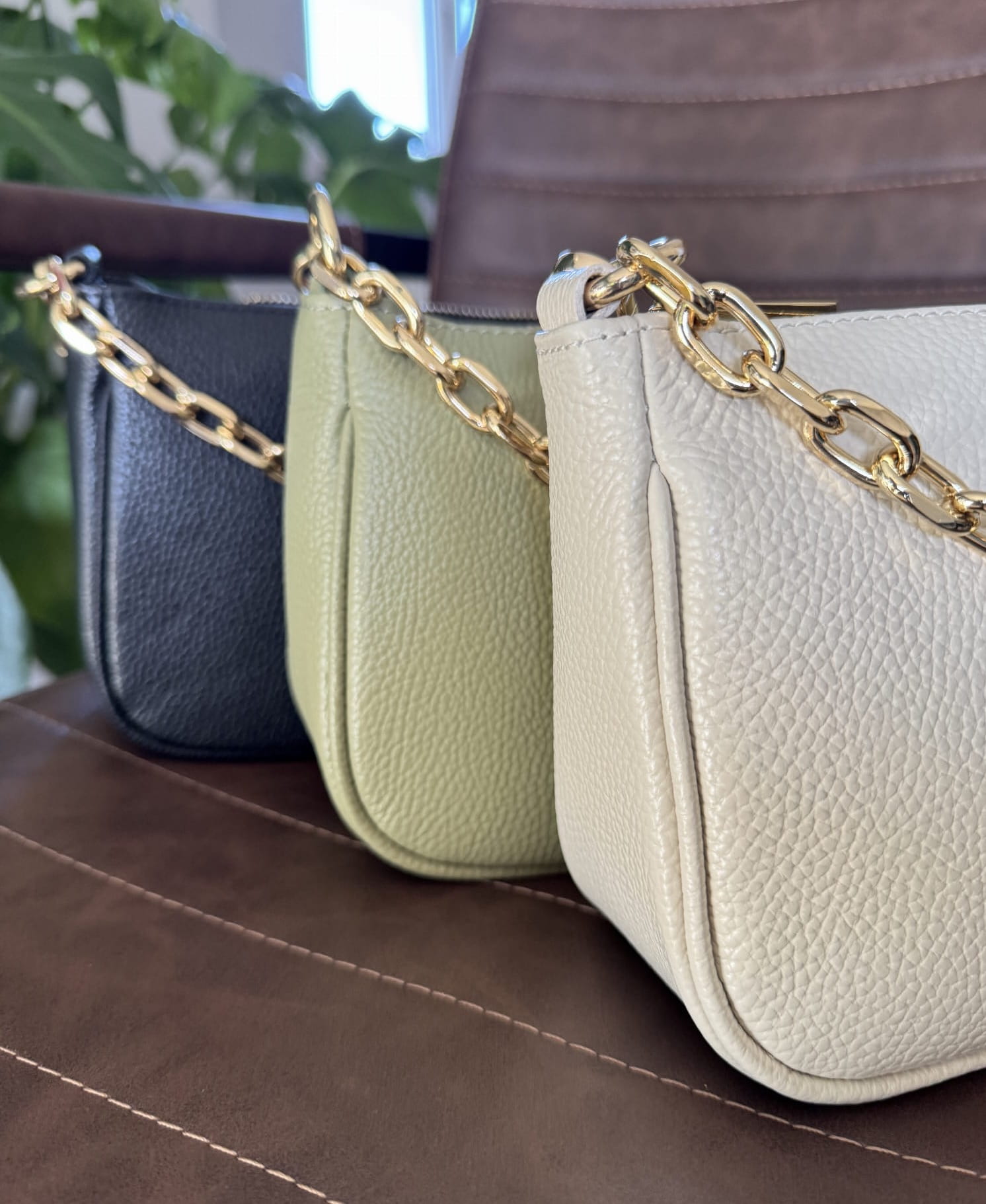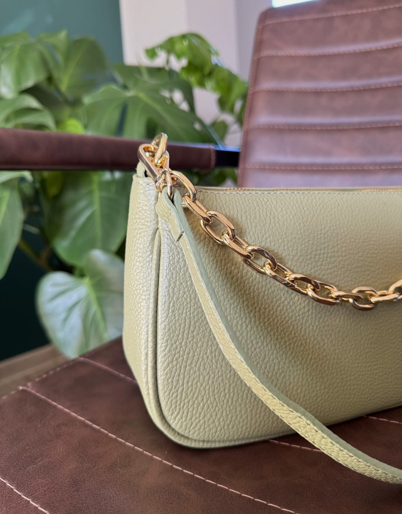 Skórzana torebka z ozdobnym łańcuszkiem na ramię oliwka