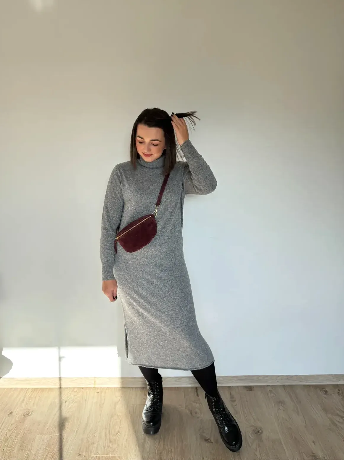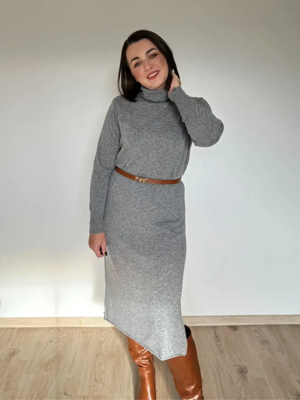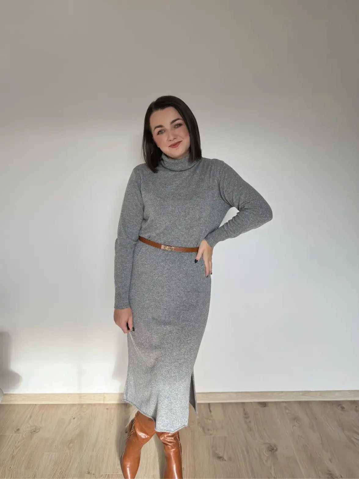Jeśli marzy Ci się sukienka, w której po prostu czujesz się pięknie i komfortowo — to ta midi z golfem jest właśnie taka. Miękka, otulająca, z delikatną domieszką kaszmiru, która robi różnicę już przy pierwszym założeniu.