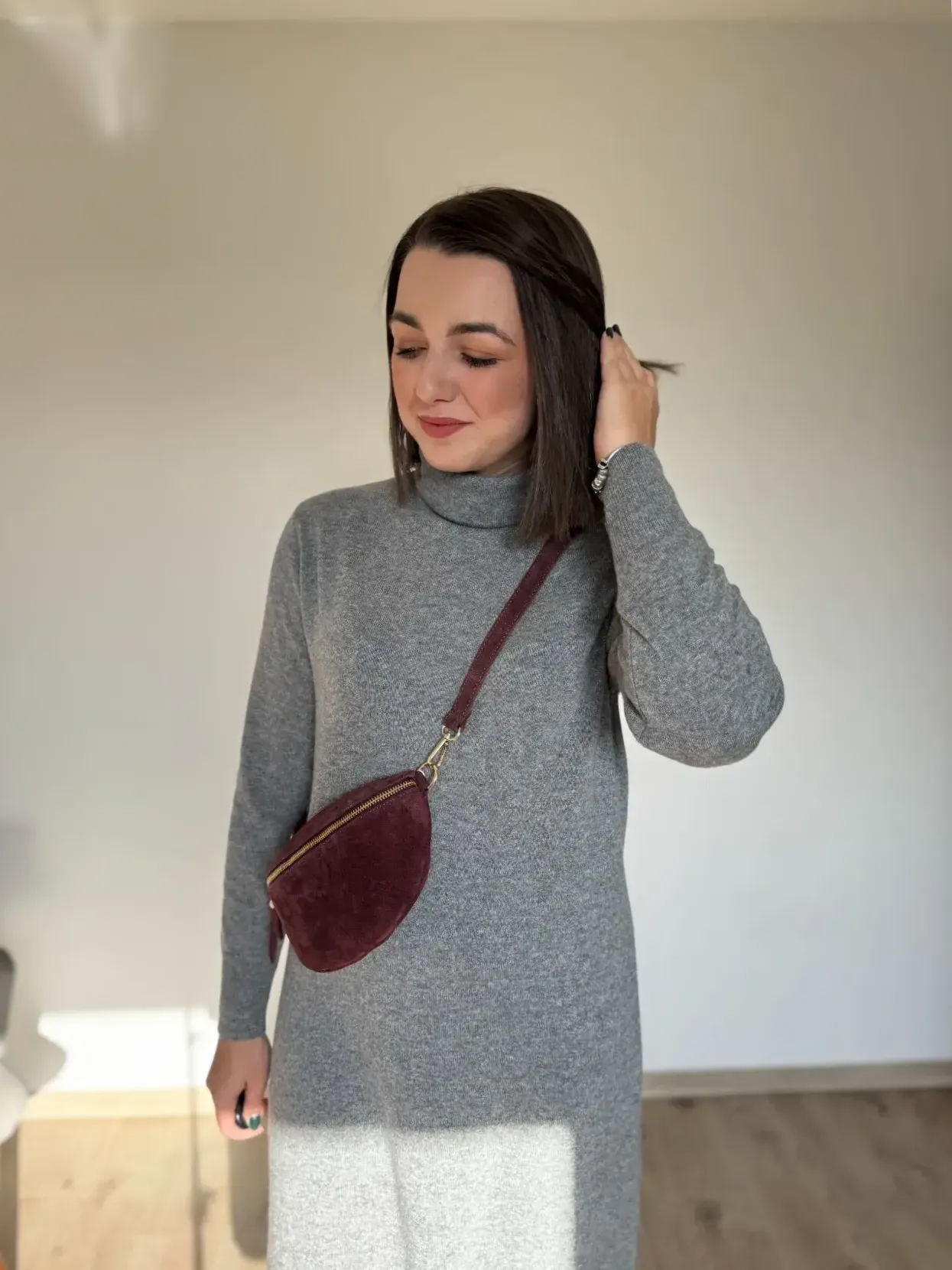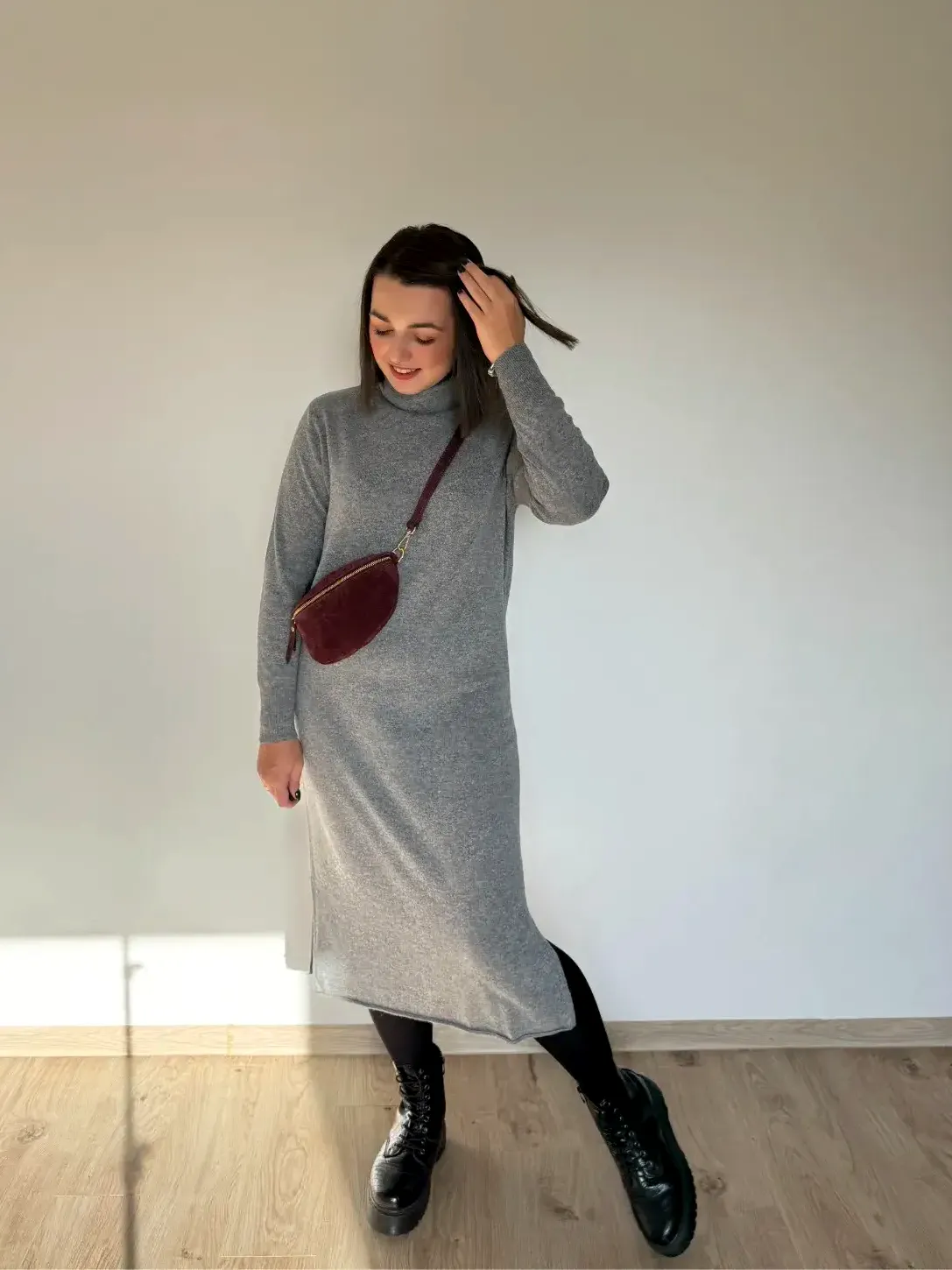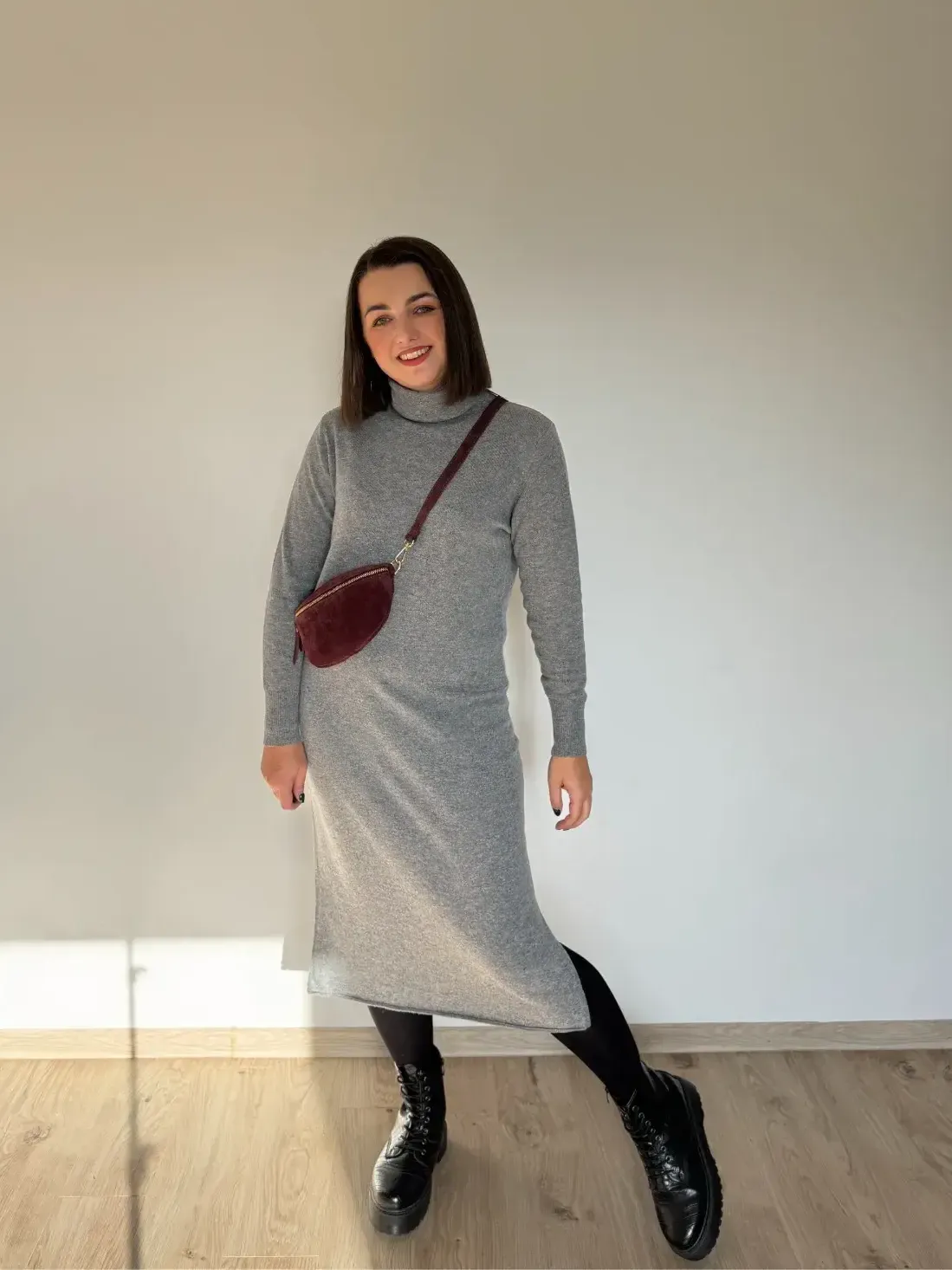 Jeśli marzy Ci się sukienka, w której po prostu czujesz się pięknie i komfortowo — to ta midi z golfem jest właśnie taka. Miękka, otulająca, z delikatną domieszką kaszmiru, która robi różnicę już przy pierwszym założeniu.