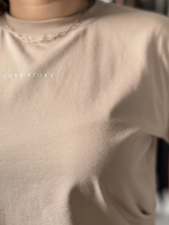 T-shirt basic bawełniany z delikatnym napisem beż