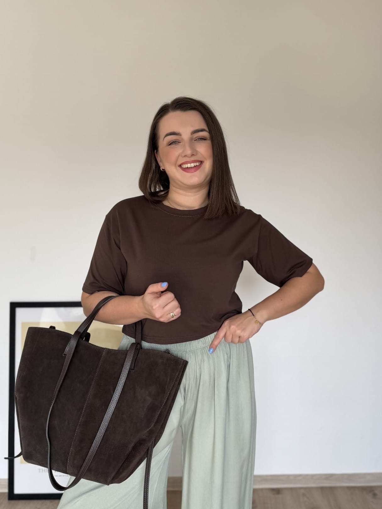 Wymiary: długość 45 cm, szerokość 52 cm – perfekcyjna do spodni z wyższym stanem.