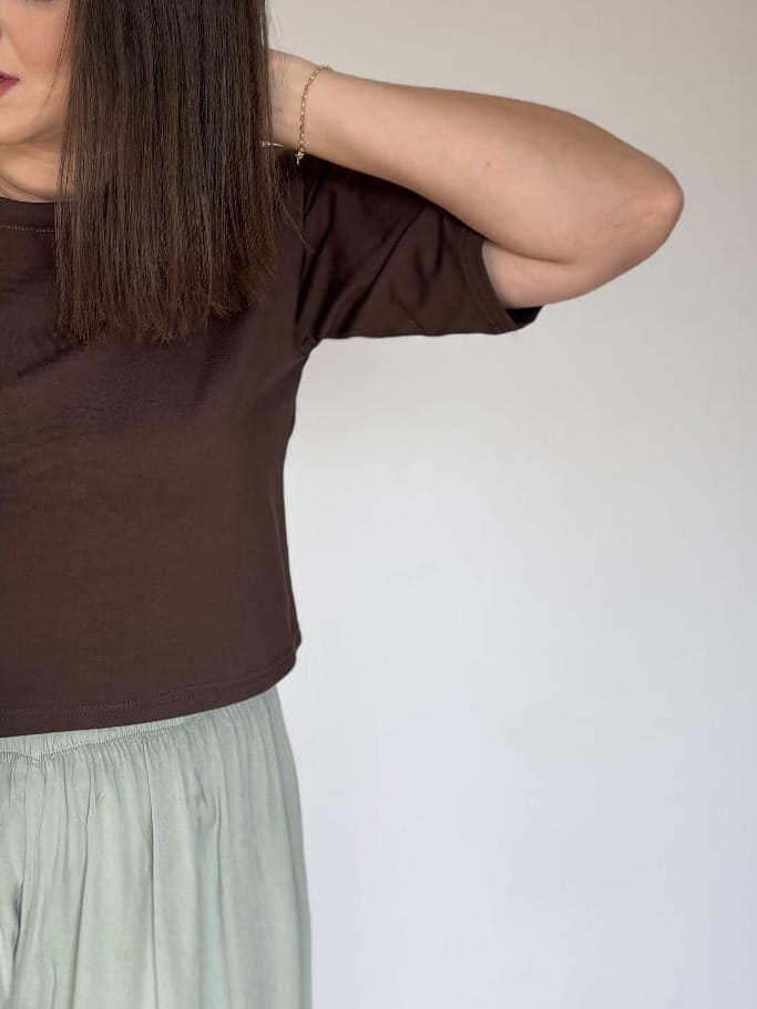 T-shirt damski basic o krótszym kroju czekolada