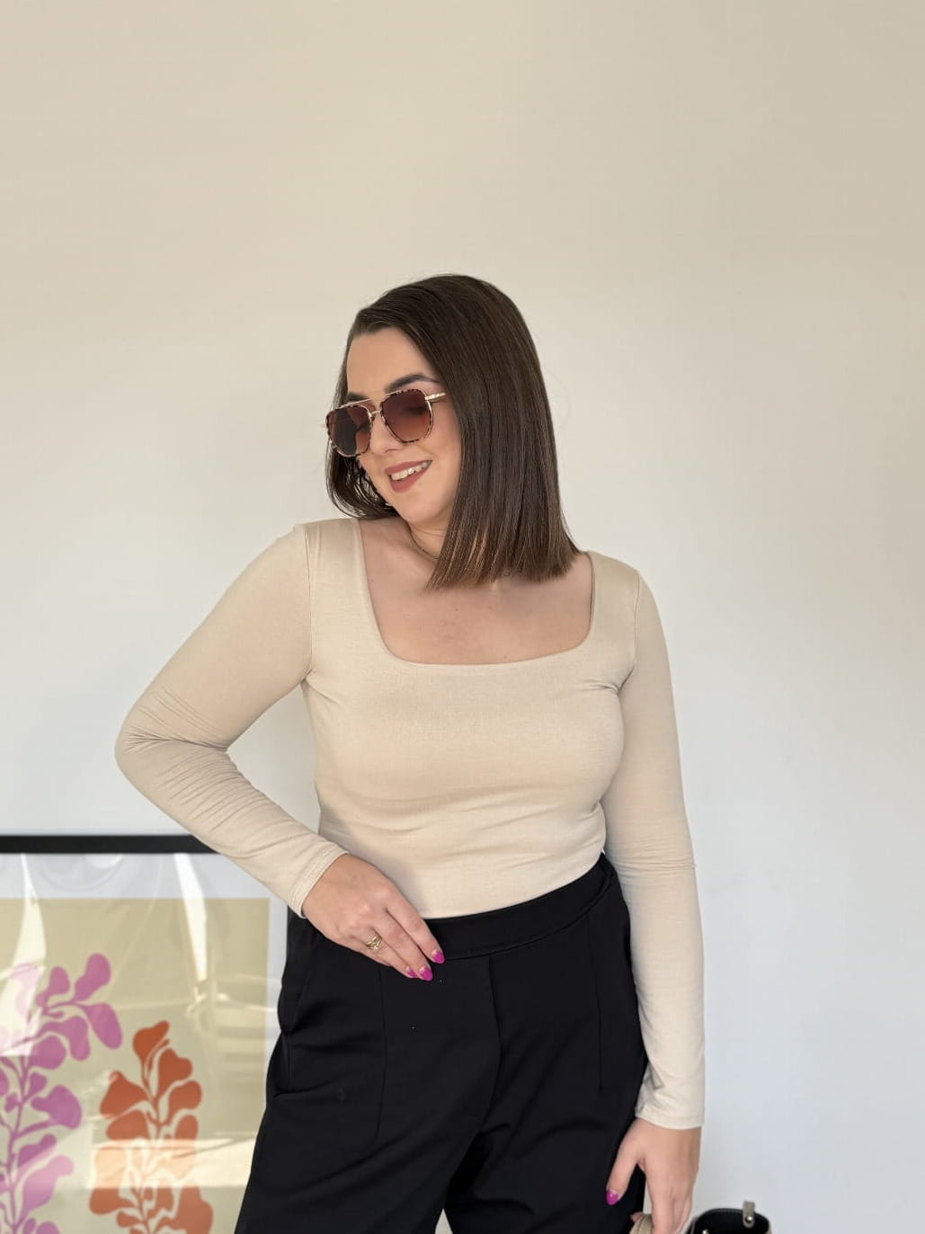 Elegancka bluzka z długim rękawem i kwadratowym dekoltem, która łączy styl z komfortem noszenia. Idealna jako baza do codziennych stylizacji, jak i bardziej eleganckich zestawów – świetnie wygląda zarówno z jeansami, spódnicą, jak i spodniami materiałowymi.