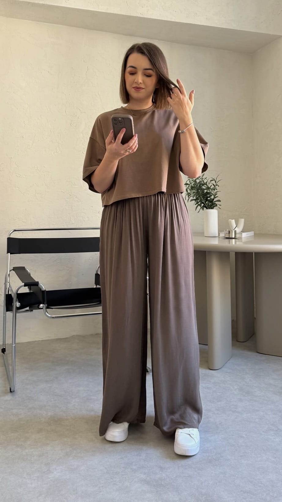 Wiskozowe szerokie spodnie na gumce OLIVIA | czekolada