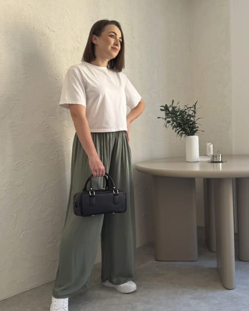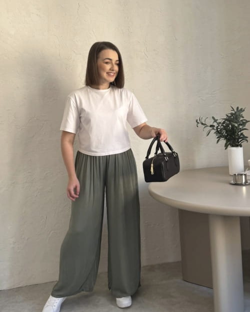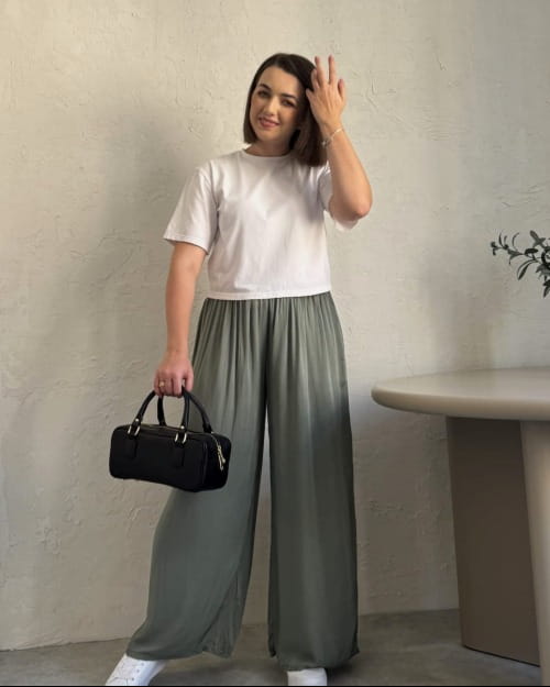 Wiskozowe szerokie spodnie na gumce OLIVIA | oliwka